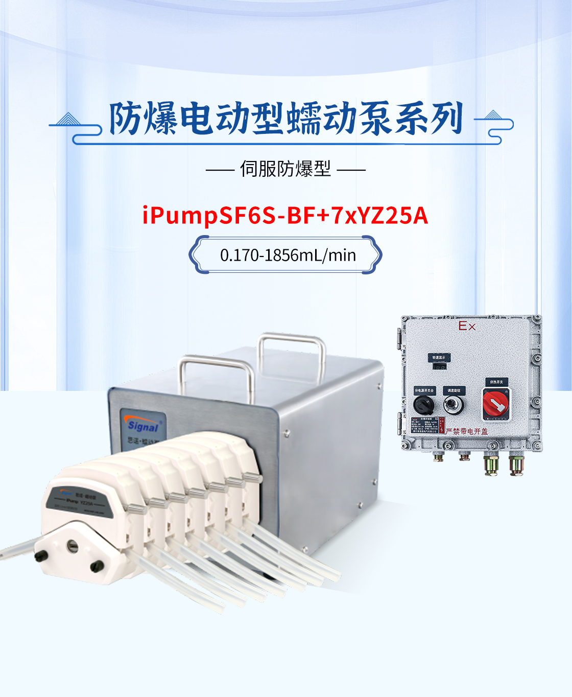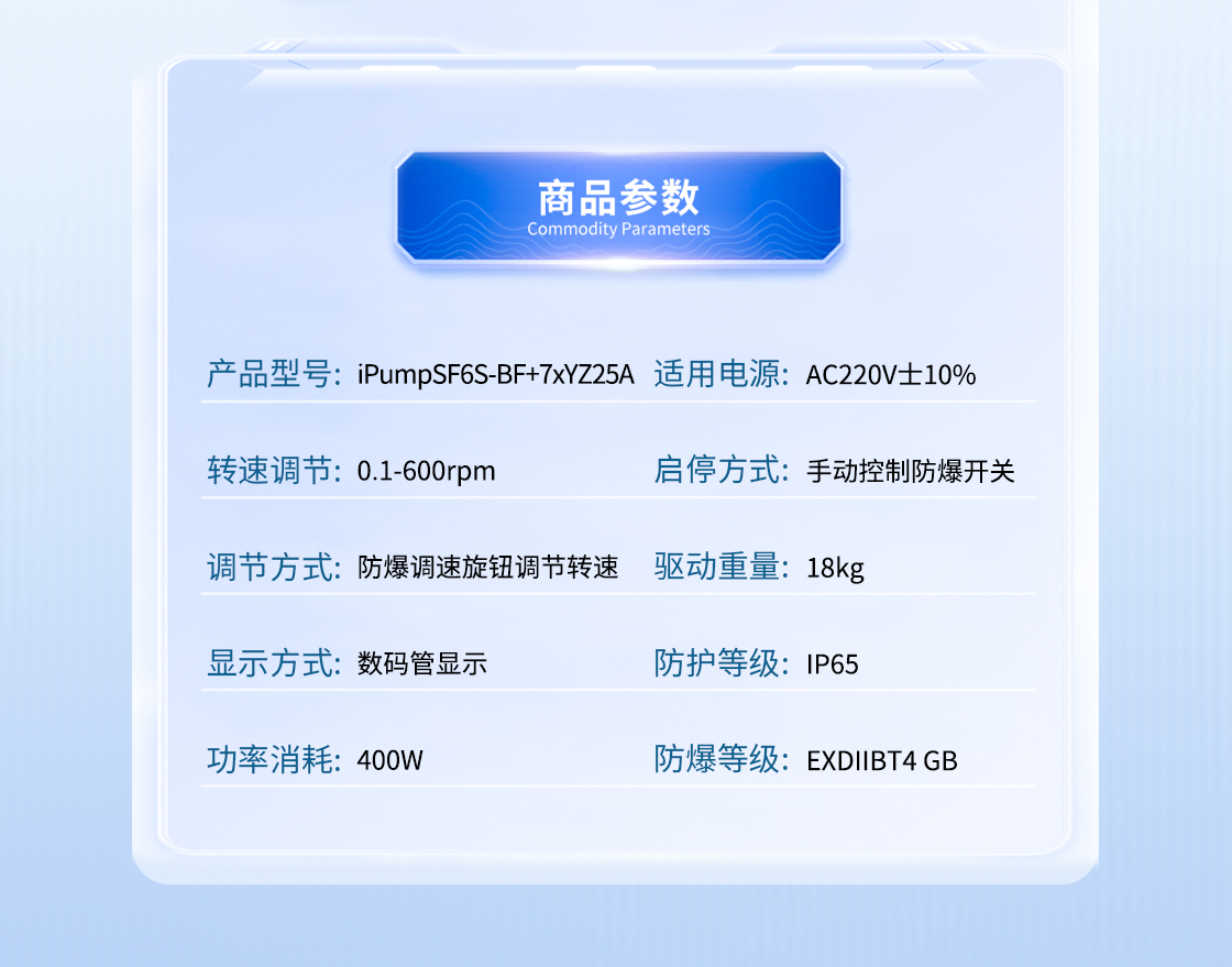 參考流量范圍:0.170-1856mL/min 防爆伺服電機,控制精準,防爆開關控制啟停 防爆等級EWxdIIBT Gb,防護等級IP65