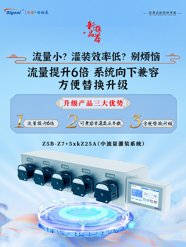 為滿足客戶對灌裝效率提升的需求,解決客戶對高流量分配的煩惱,為其帶來流體傳輸體驗,新品蠕動泵灌裝系統——Z5B-Z7+5XKZ25A重磅上市!
